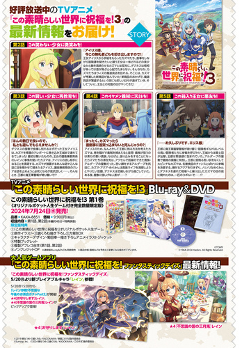 『この素晴らしい世界に祝福を!3』は、2024年7月24日(水)にBlu-ray&DVDの第1巻が発売予定! 過去のエピソードを見直しながら放送最新話を視聴すれば、このすばの世界観がより味わい深くなること間違いなしです。