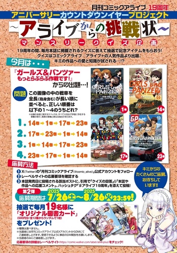 毎月本誌に掲載されるクイズの正解者のなかから、抽選で19名様にオリジナル図書カードをプレゼント(500円/全12種からランダムで1枚)! クイズは『月刊コミックアライブ』および『アライブ+』の人気作品より出題されます。今月は……『ガールズ&パンツァー もっとらぶらぶ作戦です!』! 今月も皆さんの挑戦をお待ちしています!!