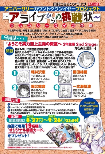 毎月本誌に掲載されるクイズの正解者のなかから、抽選で19名様にオリジナル図書カードをプレゼント(500円/全12種からランダムで1枚)! クイズは『月刊コミックアライブ』および『アライブ+』の人気作品より出題されます。今月は……『ようこそ実力至上主義の教室へ 2年生編 2nd Stage』! 皆さんの挑戦をお待ちしています!!