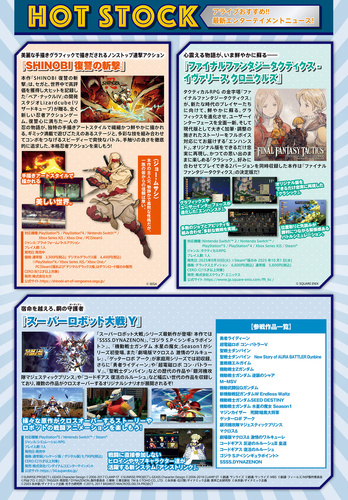 Alive Relation News & Hot Stock特集記事。新しい忍者アクションゲーム「SHINOBI 復讐の斬撃」やタクティカルRPG の金字塔「ファイナルファンタジータクティクス」、「スーパーロボット大戦」シリーズ最新作「スーパーロボット大戦Y」の情報を掲載。
