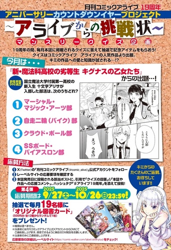 毎月本誌に掲載されるクイズの正解者のなかから、抽選で19名様にオリジナル図書カードをプレゼント(500円/全12種からランダムで1枚)! クイズは『月刊コミックアライブ』および『アライブ+』の人気作品より出題されます。今月は……『新・魔法科高校の劣等生 キグナスの乙女たち』! 皆さんの挑戦をお待ちしています!!