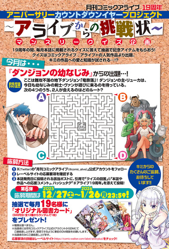 毎月本誌に掲載されるクイズの正解者のなかから、抽選で19名様にオリジナル図書カードをプレゼント(500円/全12種からランダムで1枚)! クイズは『月刊コミックアライブ』および『アライブ+』の人気作品より出題されます。今月は……『ダンジョンの幼なじみ』からの出題。正しいルートを選んで、リューカが待つ部屋を目指せ! 皆さんの挑戦をお待ちしています。