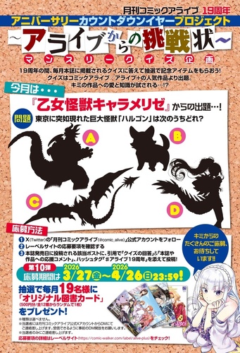 毎月本誌に掲載されるクイズの正解者のなかから、抽選で19名様にオリジナル図書カードをプレゼント(500円/全12種からランダムで1枚)! クイズは『月刊コミックアライブ』および『アライブ+』の人気作品より出題されます。