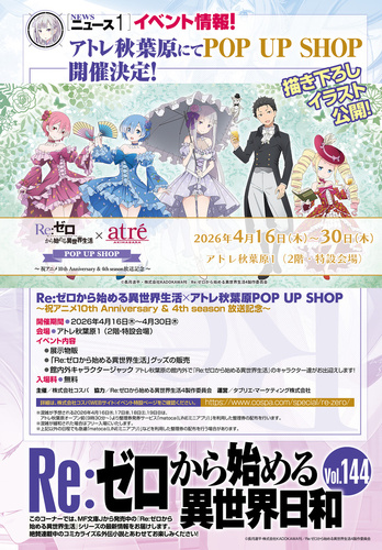 『Re:ゼロから始める異世界生活』最新情報特集記事。アトレ秋葉原で開催されるPOP UP SHOP情報や、MF文庫Jから発売中の原作シリーズ最新情報を掲載。