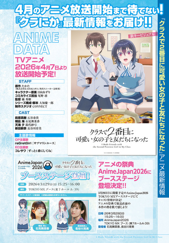 いよいよ放送が4月7日に迫った『クラスで2番目に可愛い女の子と友だちになった』のTVアニメ最新情報を掲載。