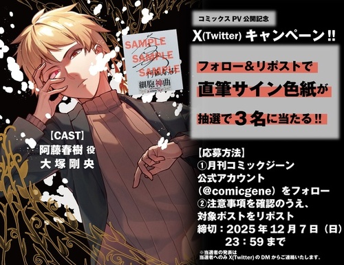 当選者へのみ、2025年12月18日頃、X(Twitter)のDM(ダイレクトメッセ ージ)にて「@comicgene」よりお知らせいたします。