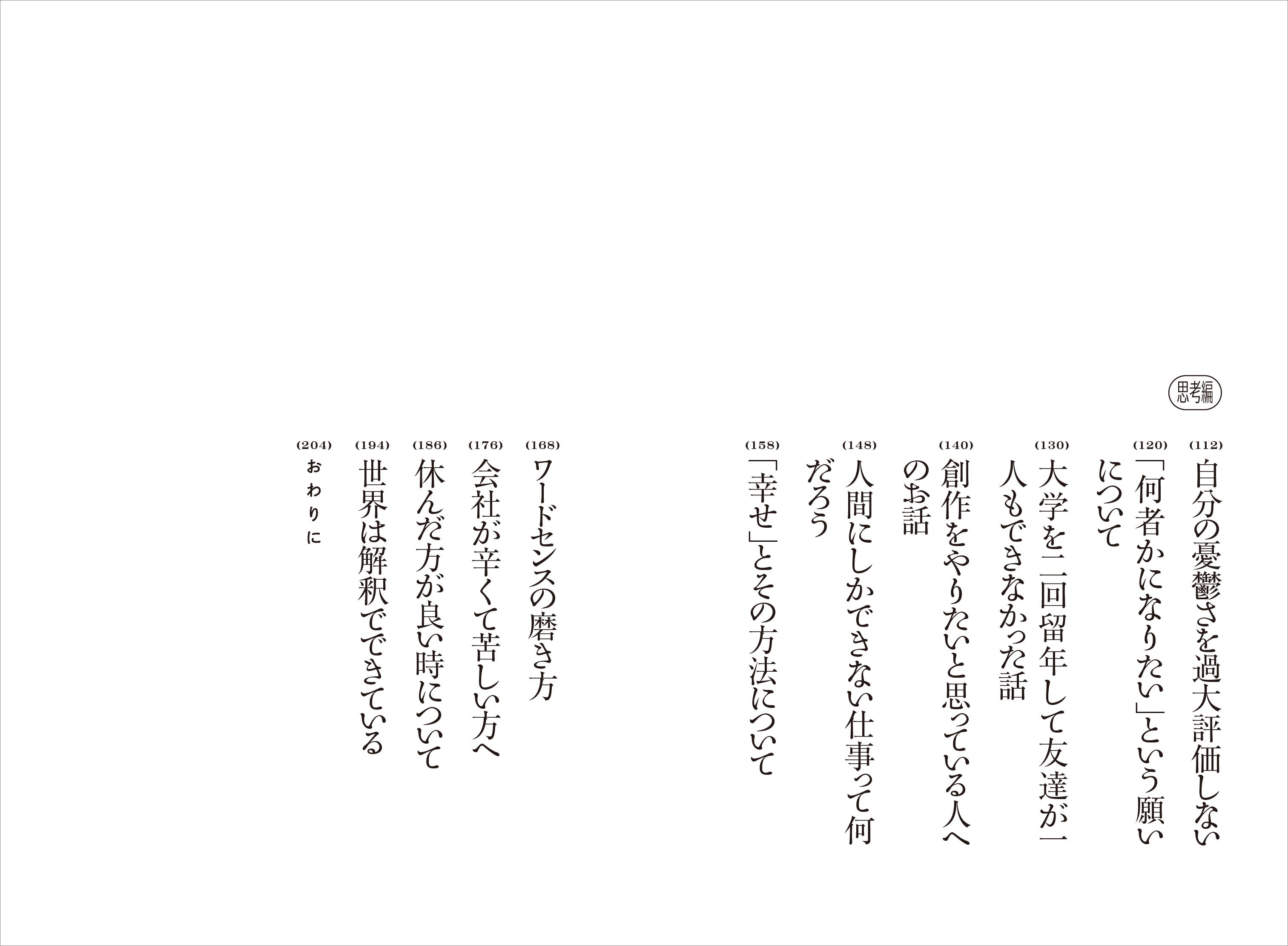 思考編では、「何者かになりたい」という願いや、自分の憂鬱さとの向き合い方、「幸せ」の考え方などについて掘り下げます。出来事そのものではなく、それをどう解釈するかに焦点を当てています。