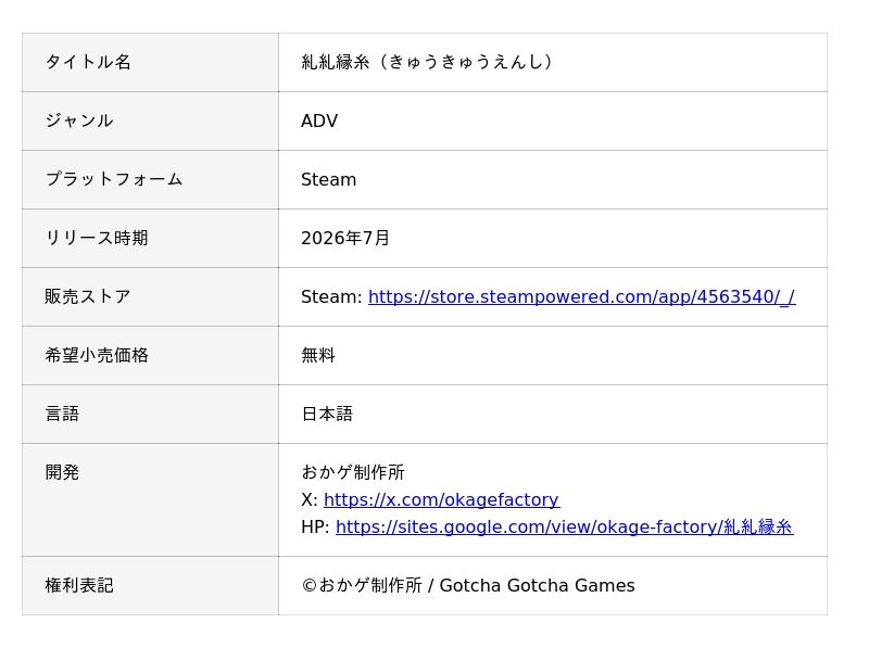 この度、株式会社KADOKAWAのグループ会社である株式会社Gotcha Gotcha Games(本社:東京都千代田区、代表取締役社長:成田聖)より、2026年4月28日(火)に、探索型現代伝奇ホラーADV『糺糺縁糸(きゅうきゅうえんし)』のSteamストアページを公開し、事前ウィッシュリスト登録受付を開始したことをお知らせいたします。